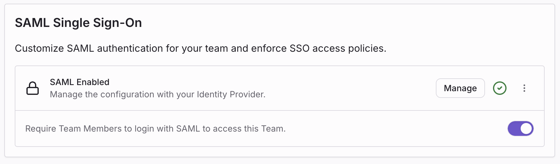 For additional security, you can enforce SAML so team members can only access team resources when their current session is authenticated with SAML.